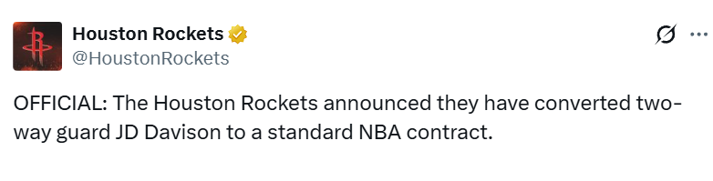 北京时间4月8日,火箭队官方今日宣布,将双向合同后卫JD-戴维森的合同转为标准NBA正式合同。据此前报道,双方签下的是一份两年合同,第二年是球队选项。火箭季后赛15人名单敲定,杜兰特申京将率队冲冠。